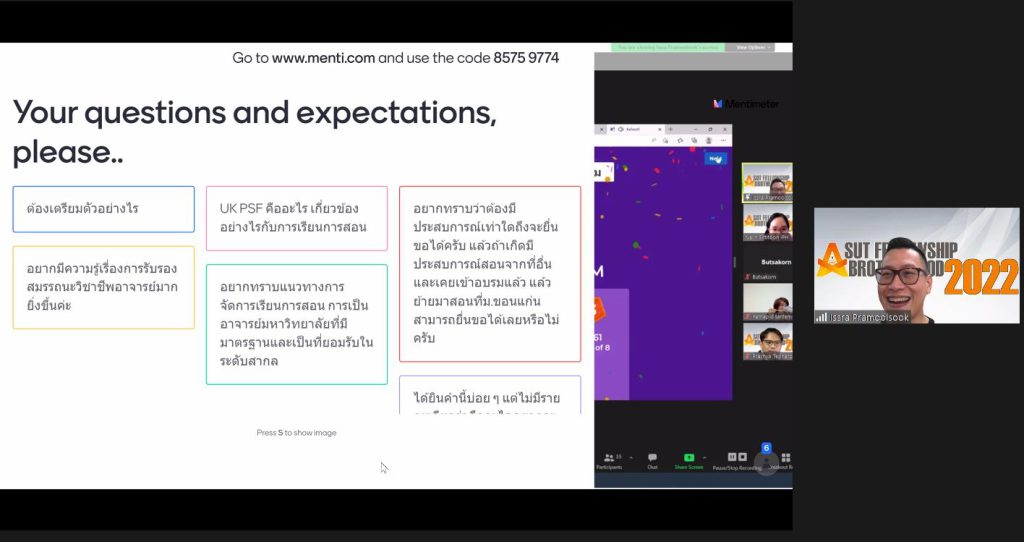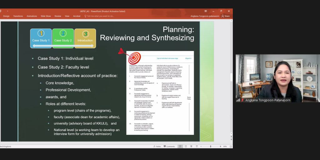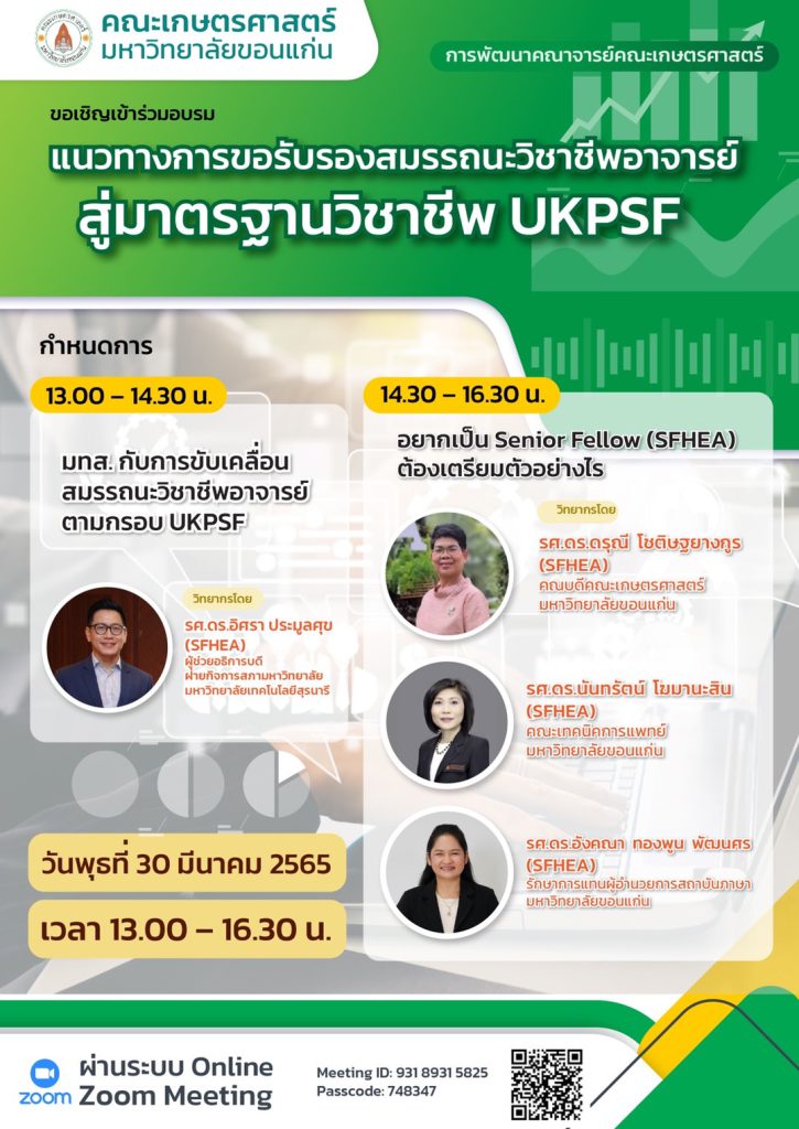 เมื่อวันที่ 30 มีนาคม 2565 เวลา 13.00 น. รักษาการแทนผู้อำนวยการสถาบันภาษา รศ.ดร. อังคณา ทองพูน พัฒนศร ได้รับเชิญจากคณะเกษตรศาสตร์ มหาวิทยาลัยขอนแก่น เพื่อเป็นวิทยากรบรรยายหัวข้อ เรื่อง แนวทางการพัฒนาอาจารย์สู่มาตรฐานวิชาชีพ UKPSF เพื่อให้คณาจารย์เข้าใจและเรียนรู้มาตรฐานวิชาชีพและสามารถปรับเปลี่ยนบทบาทในการจัดการเรียนการสอนได้อย่างมีประสิทธิภาพผ่านระบบ Online Zoom Meeting