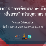 เมื่อวันที่ 4 เมษายน 2565 เวลา 9.30 น. คณะบริหารธุรกิจและการบัญชี นำโดย รศ.ดร.เพ็ญศรี เจริญวานิช คณบดีคณะบริหารธุรกิจและการบัญชี กล่าวเปิดโครงการ การพัฒนาภาษาอังกฤษ เพื่อการสื่อสารสำหรับบุคลากร KKBS พร้อมด้วยบุคลากรสายสนับสนุน คณะบริหารธุรกิจและการบัญชี เข้าร่วมกิจกรรมปฐมนิเทศ (Orientation) ผ่านระบบ Online Zoom Meeting เพื่อรับฟังการแนะนำรายละเอียดการอบรมและอาจารย์ผู้สอน โดย รศ.ดร.อังคณา ทองพูน พัฒนศร รักษาการแทนผู้อำนวยการสถาบันภาษา พร้อมทั้งรับฟังการสาธิต การใช้บทเรียนออนไลน์ English Discoveries ผ่านโปรแกรมคอมพิวเตอร์ English Discoveries โดย บริษัท ไอที เอ็ดดูซอฟต์ จำกัด เพื่อให้ผู้เข้าอบรมเข้าร่วมโครงการพัฒนาภาษาอังกฤษเพื่อการสื่อสารได้อย่างมีประสิทธิภาพ