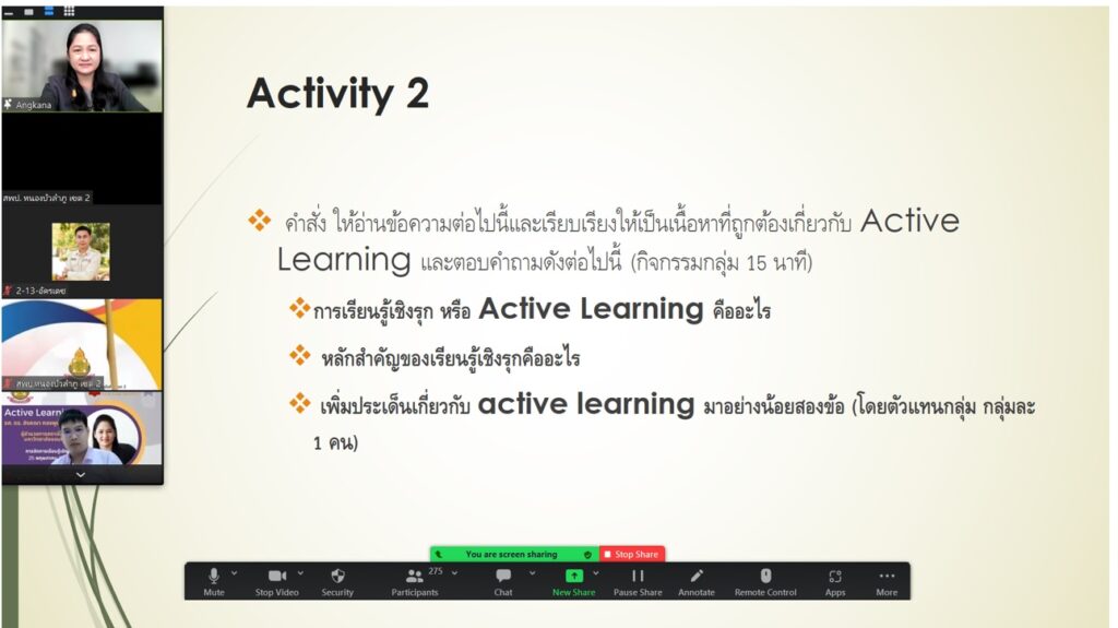 เมื่อวันที่ 25 พฤษภาคม 2565 รองศาสตราจารย์ ดร.อังคณา ทองพูน พัฒนศร ผู้อำนวยการสถาบันภาษา เป็นวิทยากรในการอบรม การจัดการเรียนรู้เชิงรุก ผ่านสื่อประชุมออนไลน์ (zoom meeting) ณ สำนักงานเขตพื้นที่การศึกษาประถมศึกษาหนองบัวลำภู เขต 2