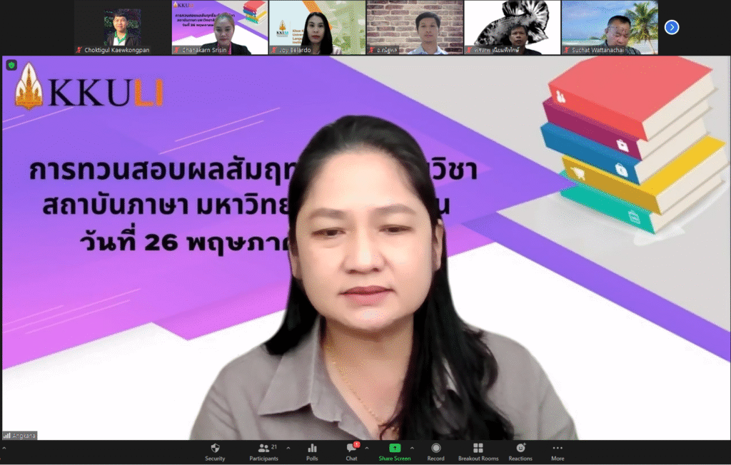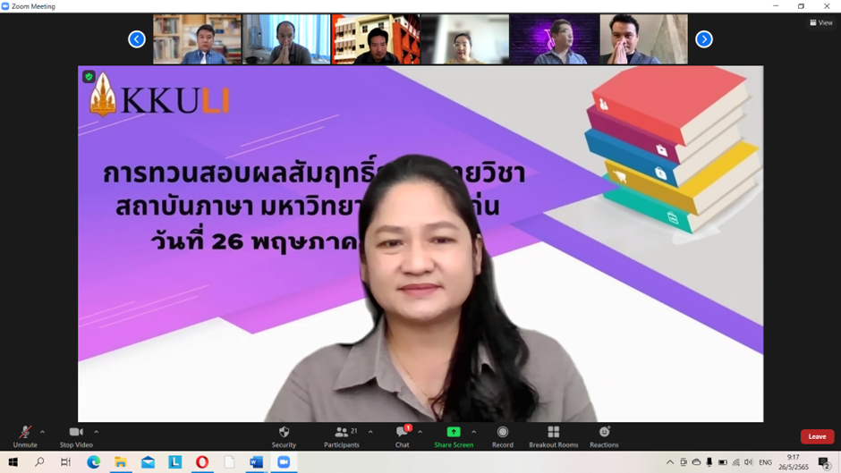 เมื่อวันที่ 26 พฤษภาคม 2565 รศ.ดร.อังคณา ทองพูน พัฒนศร ผู้อำนวยการสถาบันภาษา ได้กล่าวต้อนรับและเปิดการประชุม ทวนสอบผลสัมฤทธิ์ระดับรายวิชา สถาบันภาษา มหาวิทยาลัยขอนแก่น และ คณะกรรมการร่วมประชุมกับอาจารย์ประจำวิชาและสรุปผลการทวนสอบผลสัมฤทธิ์ระดับรายวิชา