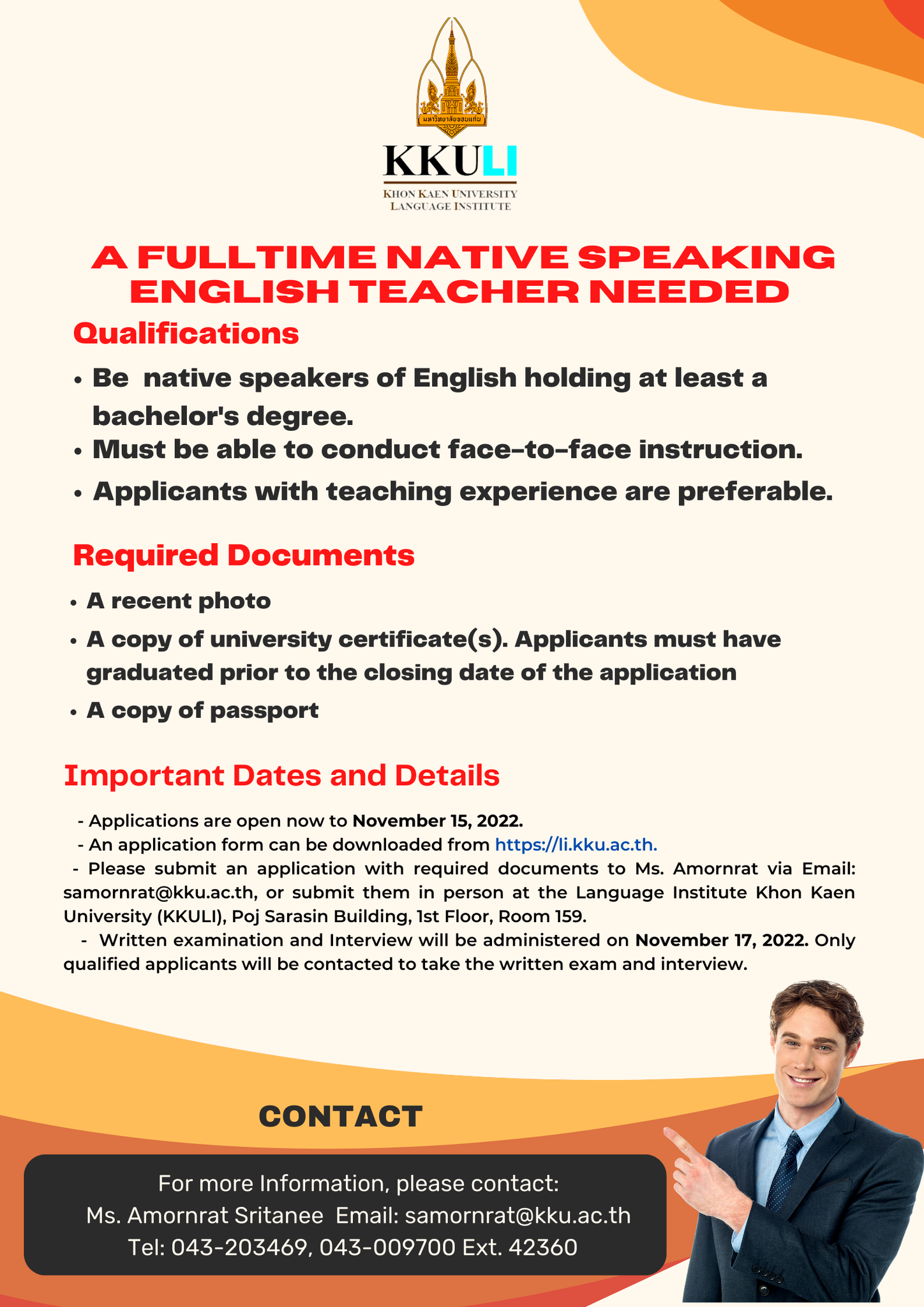 Recruit individuals to work as university employees using income. Foreign lecturer positions affiliated with the Language Institute, Khon Kaen University apply from 28 October 2022 to 15 November 2022.