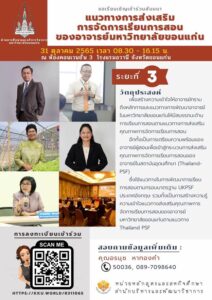 เมื่อวันที่ 31 ตุลาคม 2565 เวลา 14.55 น. ณ โรงแรมอวานี ขอนแก่น รศ.ดร.อังคณา ทองพูน พัฒนศร รักษาการแทนผู้อำนวยการสถาบันภาษา ได้เข้าร่วมเป็นคณะวิทยากรแลกเปลี่ยนเรียนรู้ประสบการณ์การขอการรับรองสมรรถนะระดับ Senior Fellow ตามกรอบ UKPSF ในโครงการสัมมนาแนวทางการส่งเสริมการจัดการเรียนการสอนของอาจารย์มหาวิทยาลัยขอนแก่น ระยะที่ 3 โดยมีวัตถุประสงค์เพื่อสร้างความเข้าใจให้อาจารย์ทราบถึงหลักการและแนวทางการพัฒนาอาจารย์ในมหาวิทยาลัยขอนแก่น ให้มีสมรรถนะด้านการเรียนการสอนตามแนวทางการส่งเสริมคุณภาพการจัดการเรียนการสอน อีกทั้งเป็นการเตรียมความพร้อมของอาจารย์ผู้สอนเพื่อเข้าสู่กระบวนการส่งเสริมคุณภาพการจัดการเรียนการสอนของอาจารย์ในสถาบันอุดมศึกษา (Thailand-PSF) ซึ่งใช้แนวทางในการพัฒนาการเรียนการสอนตามกรอบมาตรฐาน UKPSF ประเทศอังกฤษ รวมทั้งเป็นการสร้างความรู้ความเข้าใจแนวทางส่งเสริมคุณภาพการจัดการเรียนการสอนของอาจารย์มหาวิทยาลัยตามแนวทาง Thailand PSF