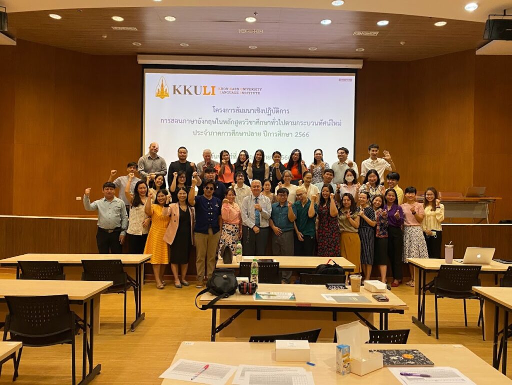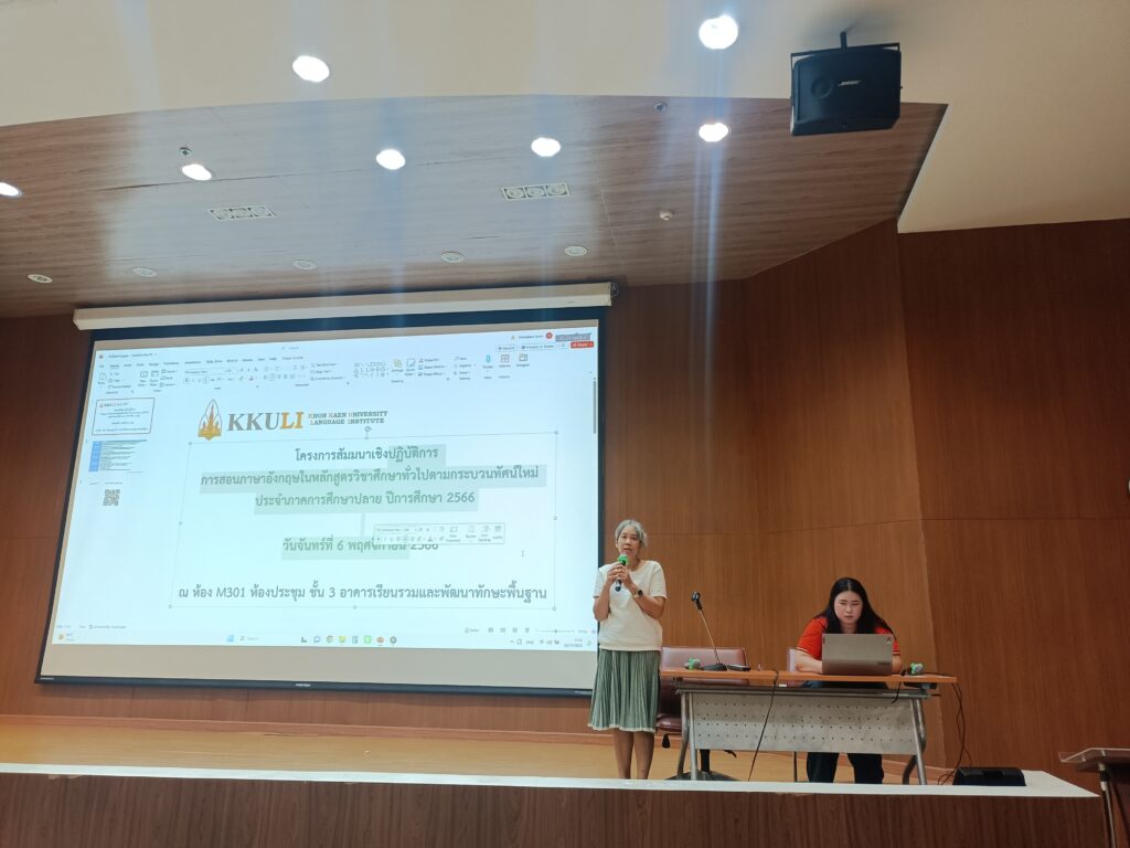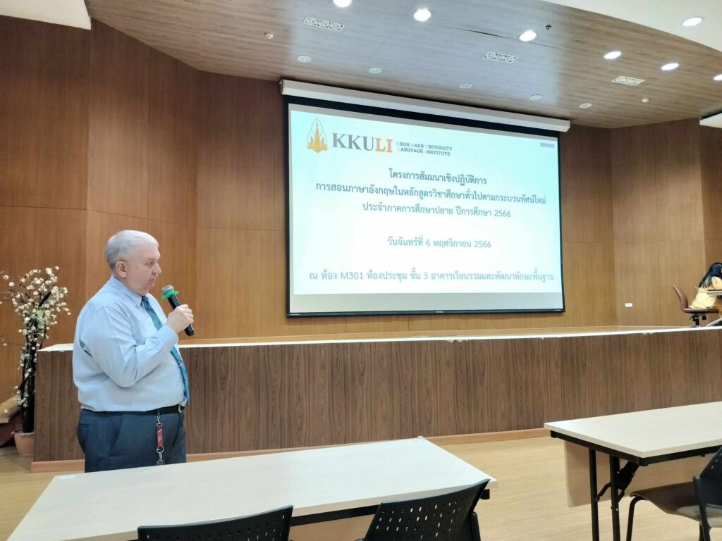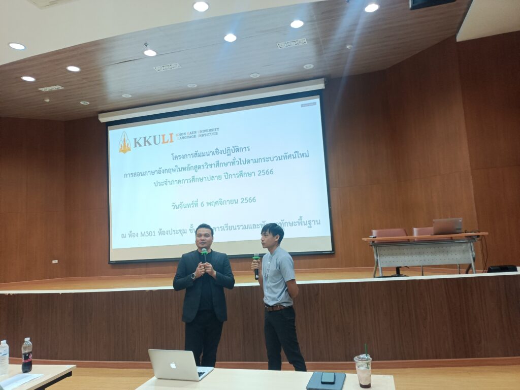 เมื่อวันที่ 6 พฤศจิกายน 2566 เวลา 08.30-16.30 น. ณ ห้องประชุม M301 อาคารเรียนรวมและพัฒนาทักษะพื้นฐาน สถาบันภาษา นำโดย ดร. วรชัย เพียทา รักษาการแทนรองผู้อำนวยการสถาบันภาษาฝ่ายบริหารและบริการวิชาการ พร้อมด้วยคณาจารย์ จัดโครงการสัมมนาเชิงปฏิบัติการ การสอนภาษาอังกฤษในหลักสูตรวิชาศึกษาทั่วไปตามกระบวนทัศน์ใหม่ สำหรับภาคการศึกษาปลาย ปีการศึกษา 2566 โดยมีอาจารย์ประจำและอาจารย์พิเศษ และคณาจารย์จากคณะสหวิทยาการ (วิทยาเขตหนองคาย) ทั้งชาวไทยและชาวต่างประเทศ เข้าร่วมการโครงการเตรียมความพร้อม เพื่อพัฒนาผู้สอนรายวิชาภาษาอังกฤษของสถาบันภาษาให้มีความพร้อมก่อนการเปิดภาคการศึกษา ซึ่งสามารถจัดการเรียนการสอนได้อย่างเป็นระบบเน้นกระบวนการสื่อสารได้การจัดกิจกรรมการเรียนการสอนภาษาอังกฤษโดยใช้ Active Learning การแลกเปลี่ยนความรู้ร่วมกัน โดยคณาจารย์ได้ระดมความคิดเห็นเกี่ยวกับการเรียนการสอนและสร้างความร่วมมือด้านการพัฒนาการเรียนการสอนต่อไปในอนาคต รวมถึงการสนับสนุนการจัดการเรียนการสอนและส่งเสริมการพัฒนาความสามารถทางภาษาอังกฤษของผู้เรียนอย่างมีประสิทธิภาพด้านต่างๆ ที่เกี่ยวข้องต่อไป