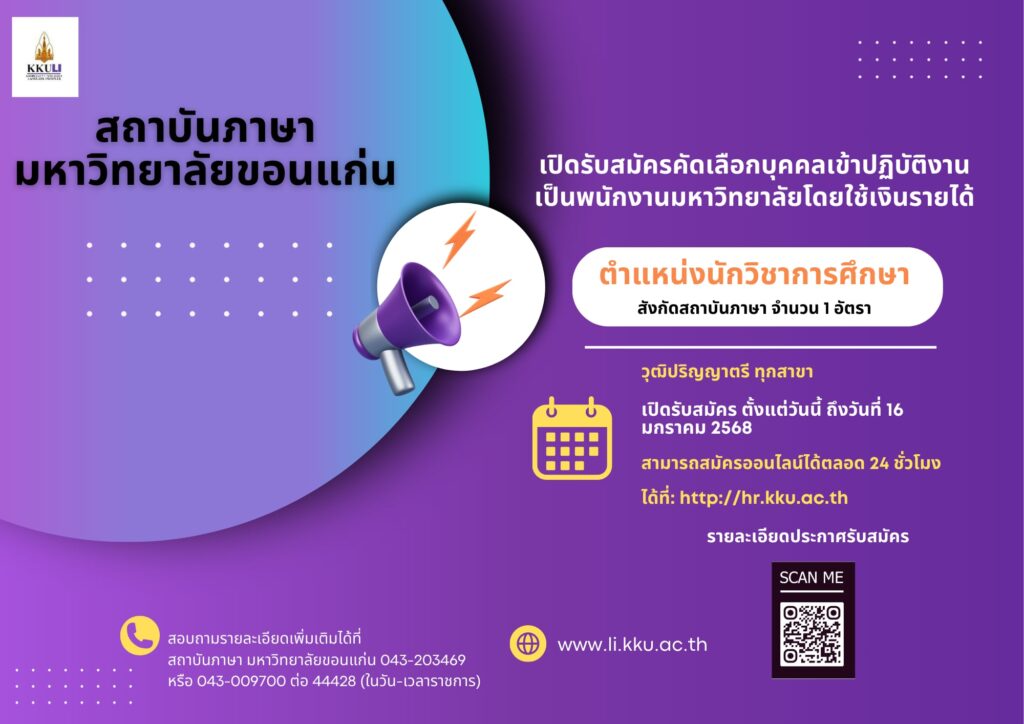 สามารถสมัครออนไลน์ได้ตลอด 24 ชั่วโมง ได้ที่ http://hr.kku.ac.th ติดต่อสอบถามรายละเอียดเพิ่มเติมได้ที่ ข้อความ fb สถาบันภาษา มหาวิทยาลัยขอนแก่น หรือโทร 043-203469 ในวัน-เวลาราชการนะคะ